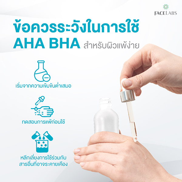 แม้ว่า AHA BHA จะเป็นสารผลัดเซลล์ผิวที่มีประสิทธิภาพ แต่สำหรับผู้ที่มี ผิวแพ้ง่าย เป็นสิว การใช้งานต้องใส่ใจเป็นพิเศษ เพราะหากใช้ไม่ถูกวิธีอาจทำให้เกิดการระคายเคืองได้ง่าย ข้อควรระวัง คือ