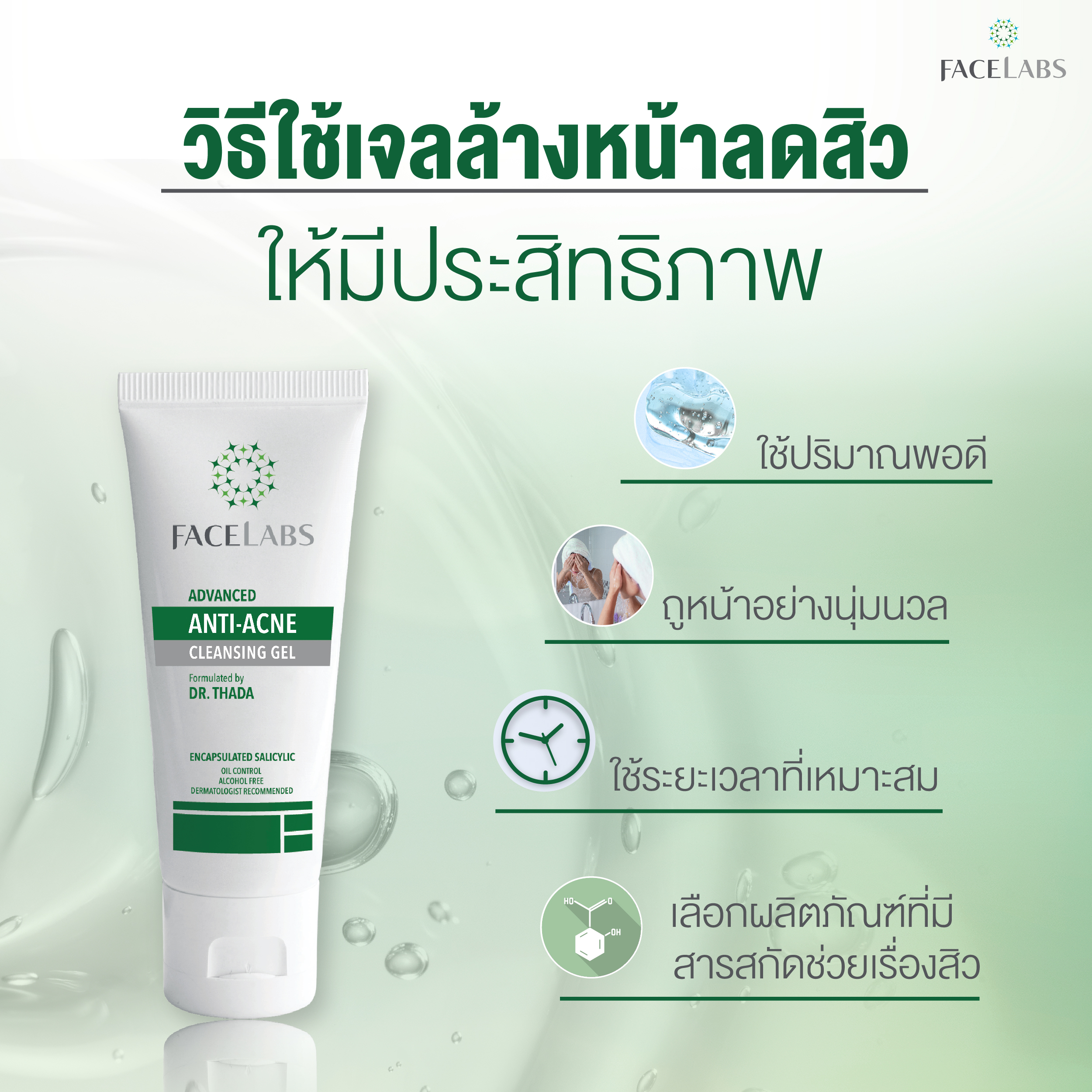 เจลล้างหน้าลดสิวที่ดี ไม่ใช่เจลล้างหน้าอะไรก็ได้ แต่ต้องเป็นเจลล้างหน้าที่มีสารสกัดที่ช่วยเรื่องสิวโดยเฉพาะ เช่น Salicylic Acid, Tea Tree Oil เป็นต้น เพื่อช่วยควบคุมความมัน ลดการอุดตัน และลดการอักเสบของสิว