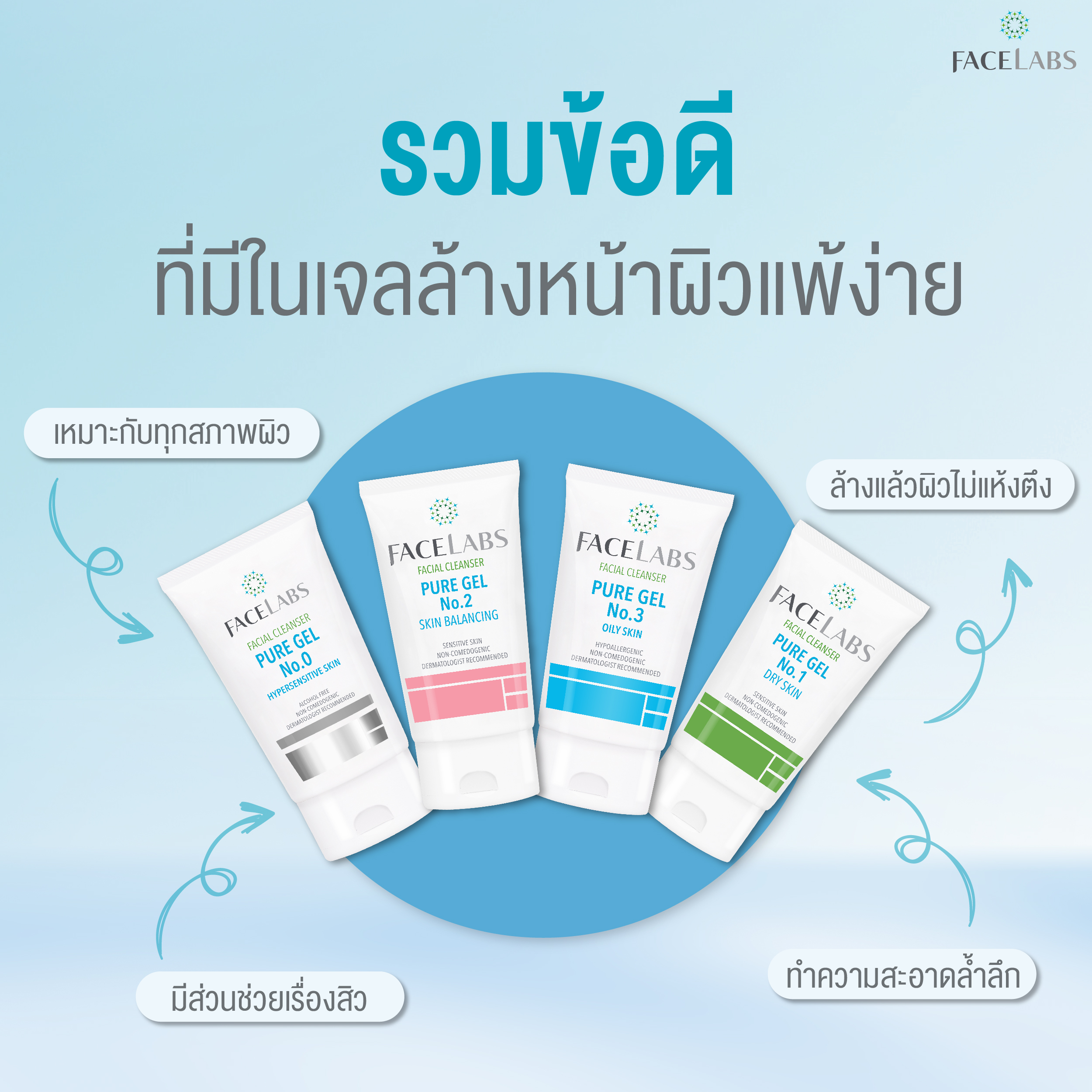 มาดูแลผิวหน้าอย่างอ่อนโยนไปด้วยกันกับ FACELABS Facial Cleanser Pure Gel เจลล้างหน้าบริสุทธิ์ ที่มีให้เลือกถึง 4 สูตร คือ ผิวแพ้ง่าย (No.0), ผิวแห้ง (No.1), ผิวปกติ (No.2) และผิวมันมาก (No.3) ทุกสูตรจะช่วยปลอบประโลมผิวอย่างอ่อนโยน ไม่เกิดการแพ้ และเป็นสิวอย่างแน่นอน